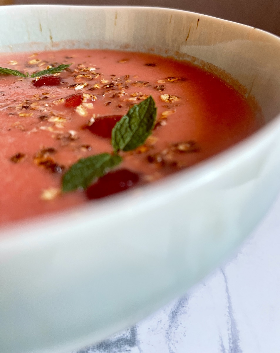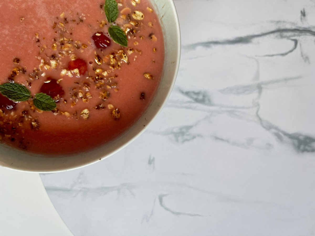 Tálaljuk, majd díszítsük a félretett dinnyekockákkal, a granolával és a mentával.