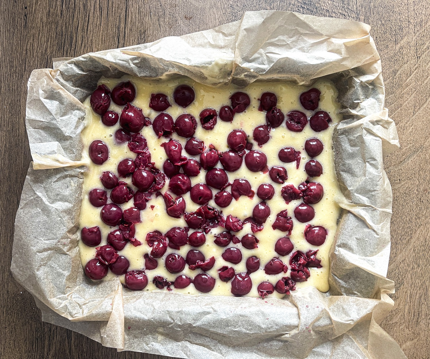 egyenletesen szórjuk meg a kimagozott meggyel.