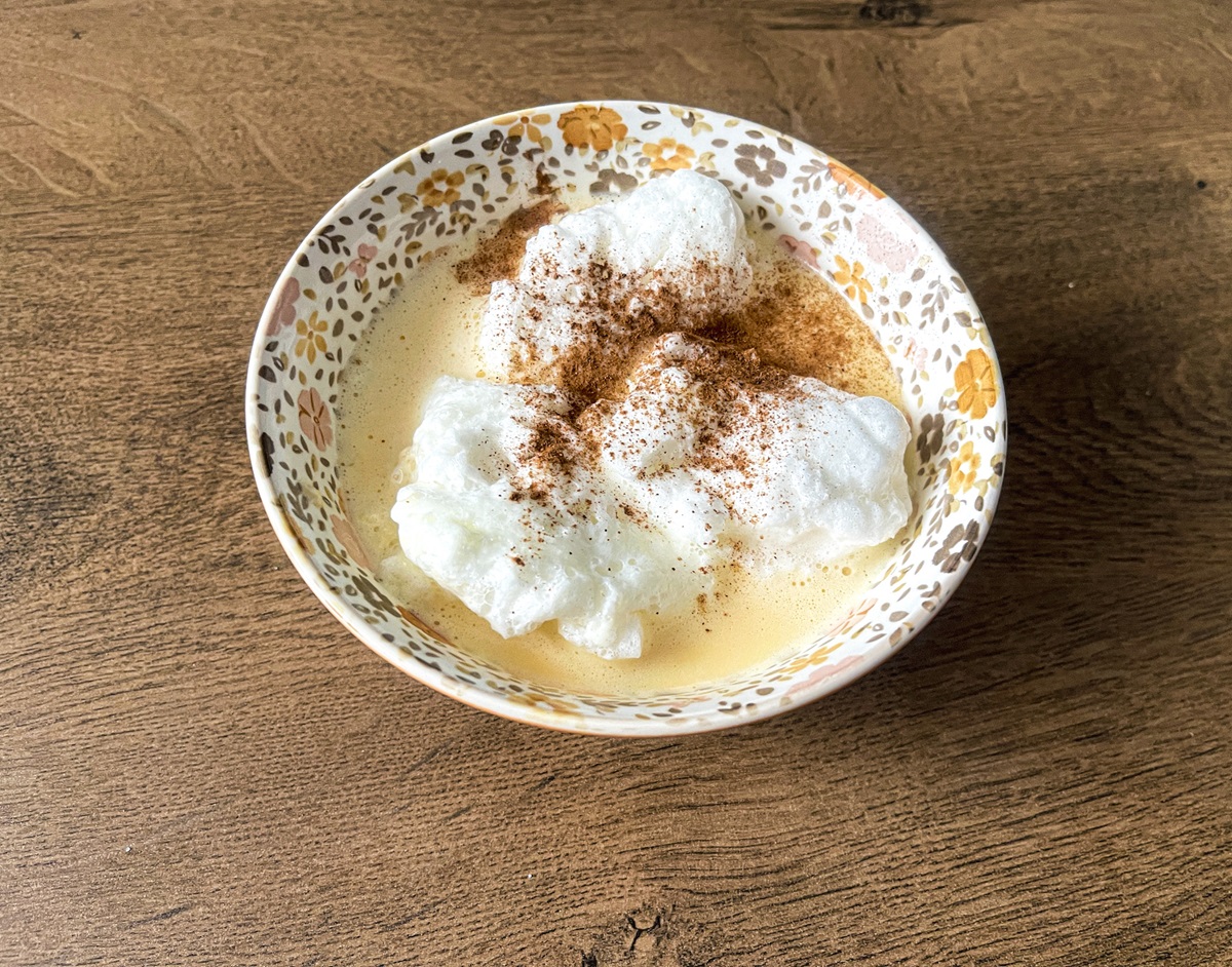 vaníliás tejet tálkákba vagy poharakba, és helyezd rá a főtt tojáshabokat. Díszítheted