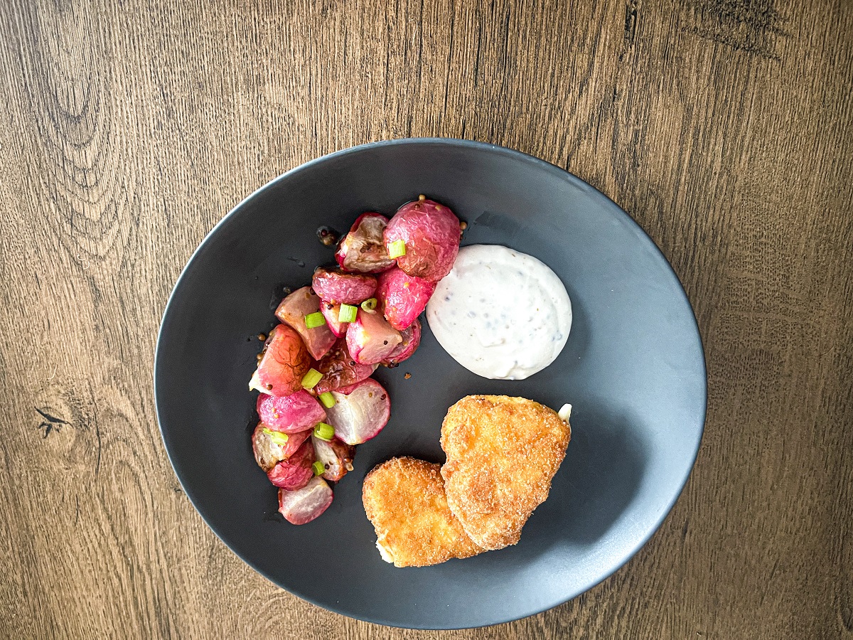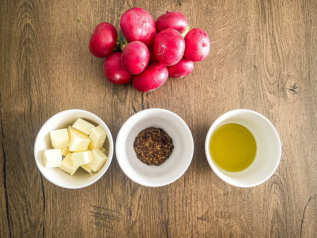 olvasztott vajat, majd forgasd meg ebben a mártásban a kisült retek darabokat.