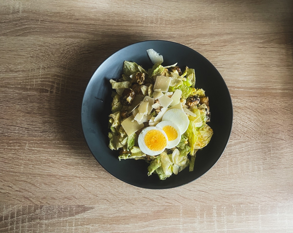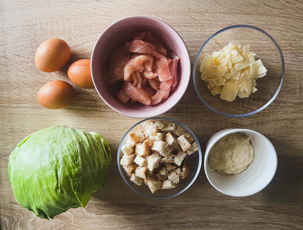 Egy nagy tálba tedd bele a felaprított salátát. Keverd bele a grillezett vagy sült csirkét. Add hozzá a szeletelt főtt tojást és a krutonokat.