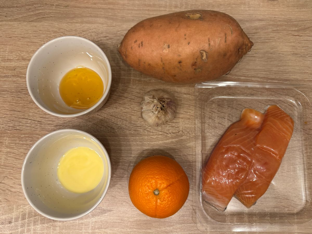 édesburgonyapürét kanalazd a tányérra. Tedd rá a narancsos lazacfilét. Csorgasd