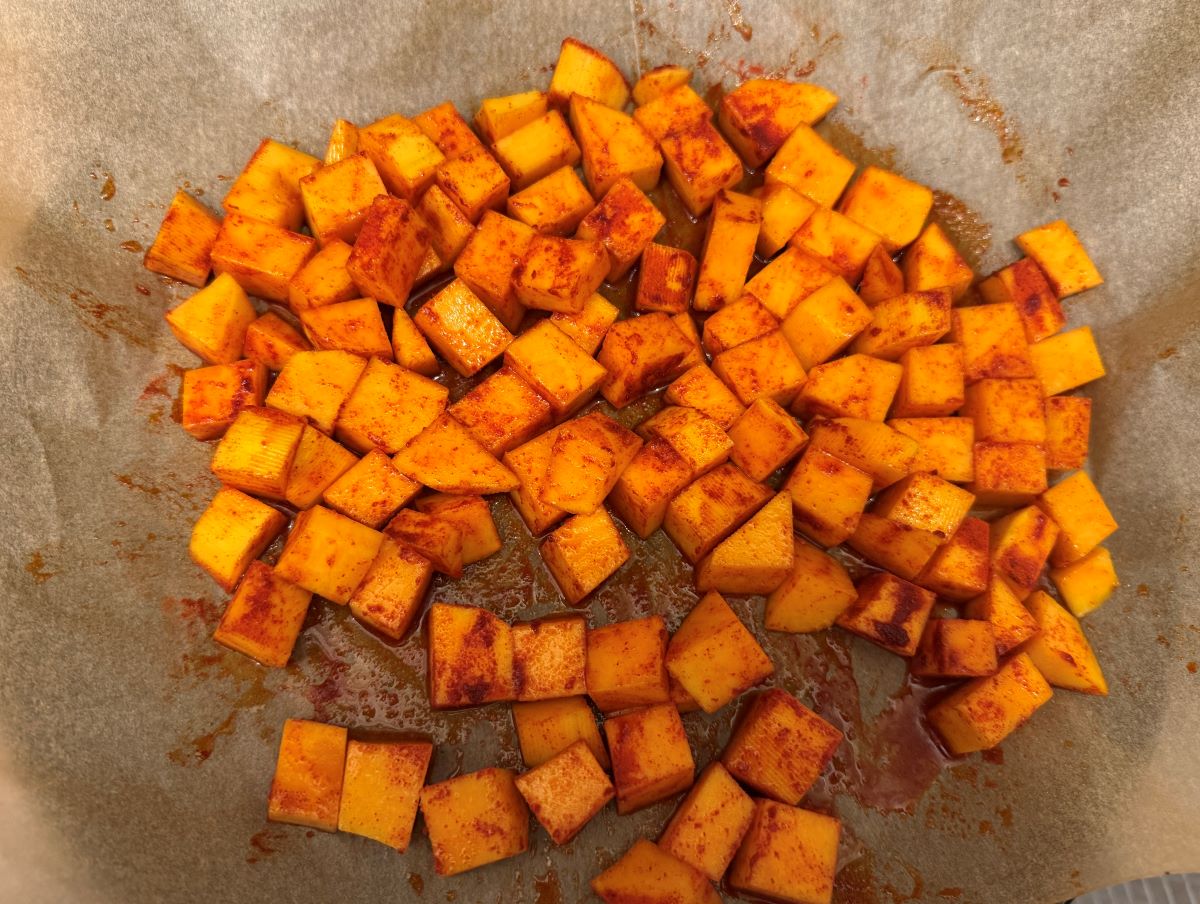 Hámozd meg és kockázd fel a sütőtököt, majd olívaolajjal, füstölt paprikával,