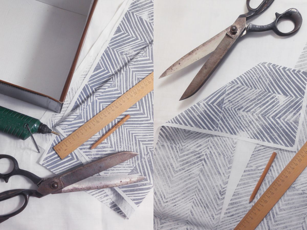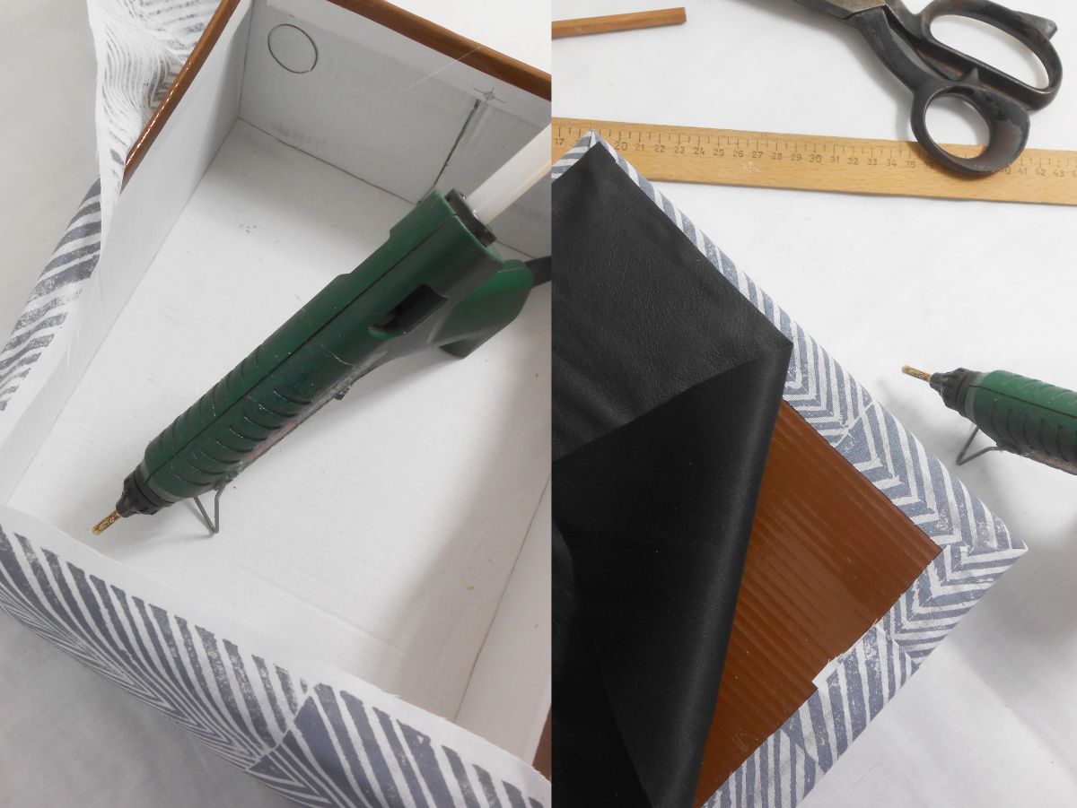 Fektessük a kelmét a dobozra és egy ragasztópisztollyal