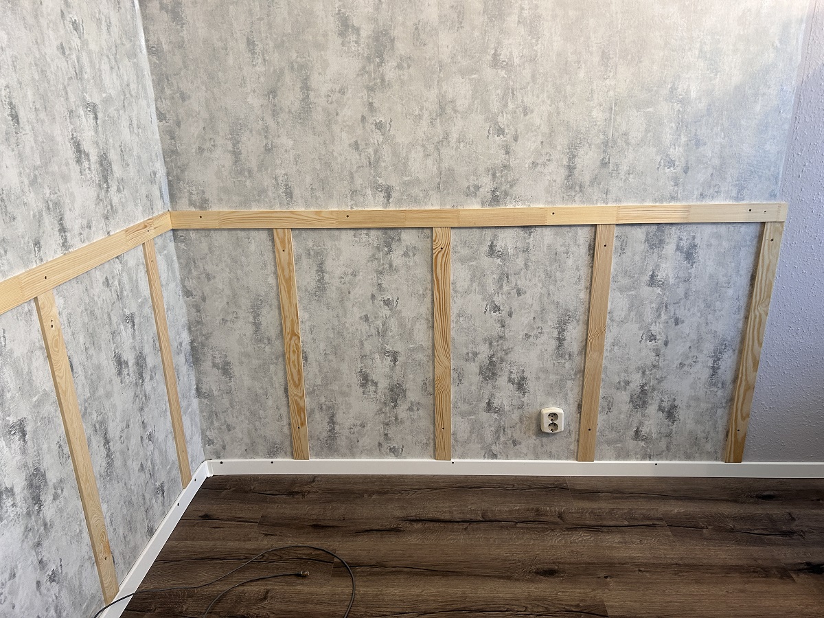 A tervem az volt, hogy a fal aljára padlószegélyt ragasztok, 6x90 cm-es falapokat fúrok be a felső léc és aközé, majd a tetejére egy