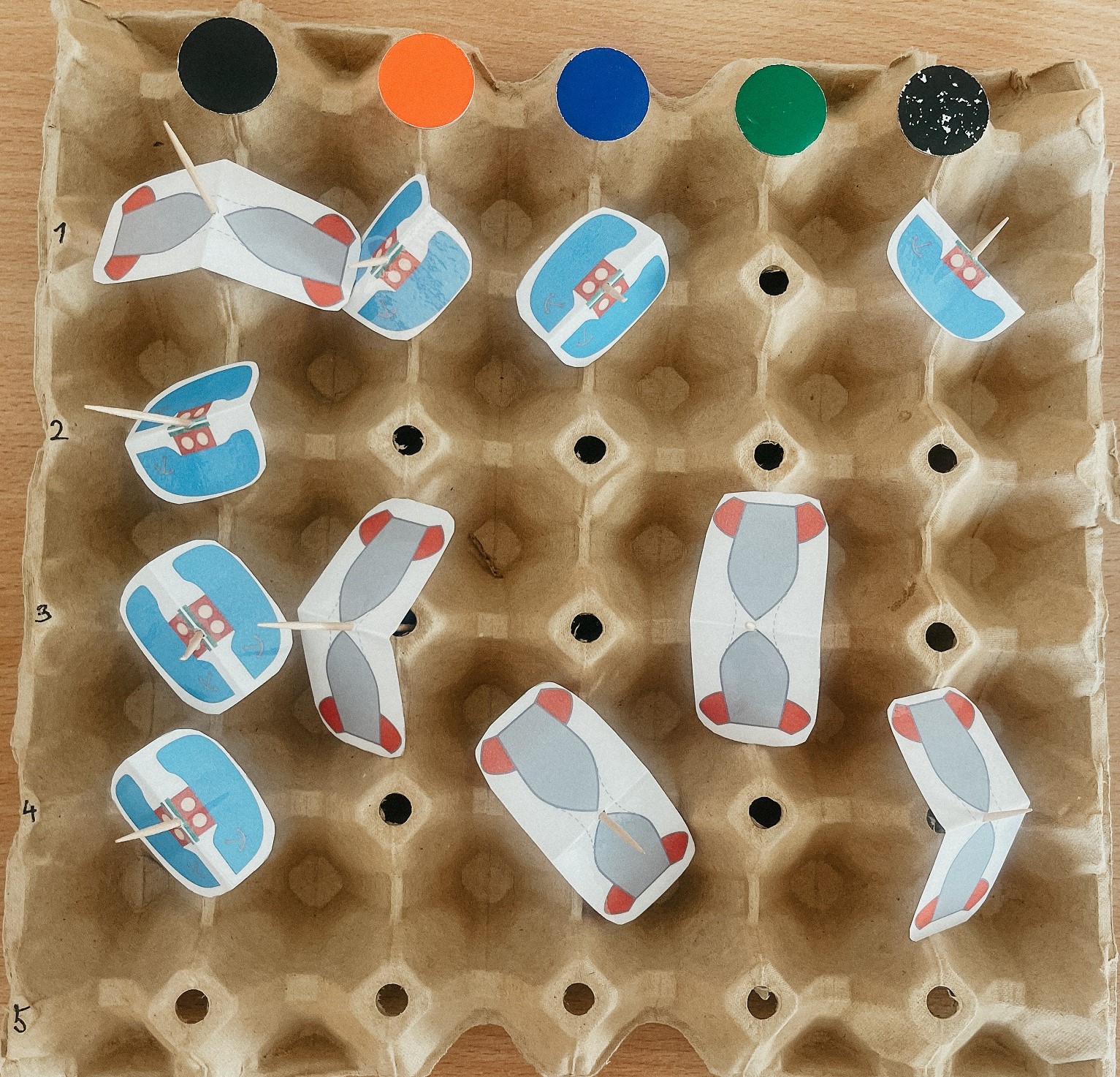 Én hajókat nyomtattam, majd lelamináltam, félbehajtottam, végül fogpiszkálót szúrtam a közepébe. Ugyanígy készítettem azokat is, amelyekkel a már mondott mezőket jelöljük.