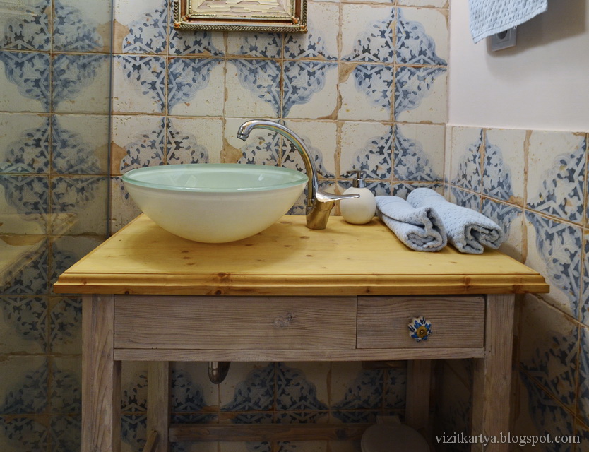 Fürdőszobánkban is a kék-fehér színvilágot tartottam meg, itt a mennyezetig fut a csempe, és egy üvegfal került a zuhanyzóhoz, hogy a tér látványa megmaradjon.
