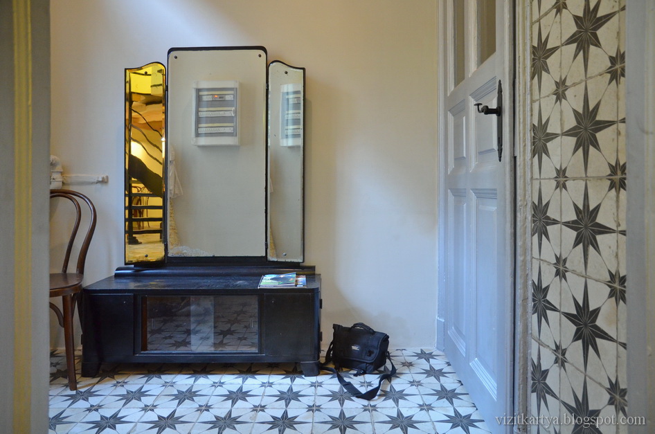 Az ágyat vettük, de a többi berendezést a lomtalanításkor talált régi székekkel és kis asztallal oldottuk meg, amit persze átcsiszoltunk és lefestettünk. A lakásba egy kis előszobából léphetünk be, ide is egy igazi antik tükrös szekrényt tettünk, amit átfestettem feketére, mert az előszoba burkolata fekete-fehér.